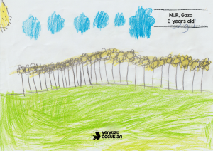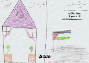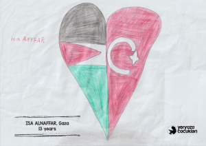 Bologna Festivali’nde sergilenen bu resimler, Gazze’nin sessiz çığlığını çocukların saf ve güçlü dünyasıyla duyurmayı amaçlıyor. Bu özel seçki; hem dünyanın dört bir yanından farklı uyruklardaki çocukların Gazze ile dayanışma içinde çizdiği eserleri hem de 7 Ekim sonrası Türkiye’ye gelen Gazzeli çocukların bizzat kendi elleriyle kağıda döktüğü tanıklıkları bir araya getiriyor. Üç yıldır Türkiye’ye sığınan 300’den fazla çocukla psikososyal destek çalışmaları yürüten ve faaliyetlerini doğrudan Gazze içerisinde de sürdüren YEÇED olarak, bu çizimleri sadece birer sanat eseri değil; kuşatma altında büyümenin getirdiği ağır duygusal yükün birer yansıması olarak görüyoruz. Amacımız, çocukların yaşadıklarını bu uluslararası platformda görünür kılarak Gazze’nin hikâyesini hafızalarda diri tutmak ve vicdan sahibi herkesi bu insani sorumluluğa ortak etmektir.