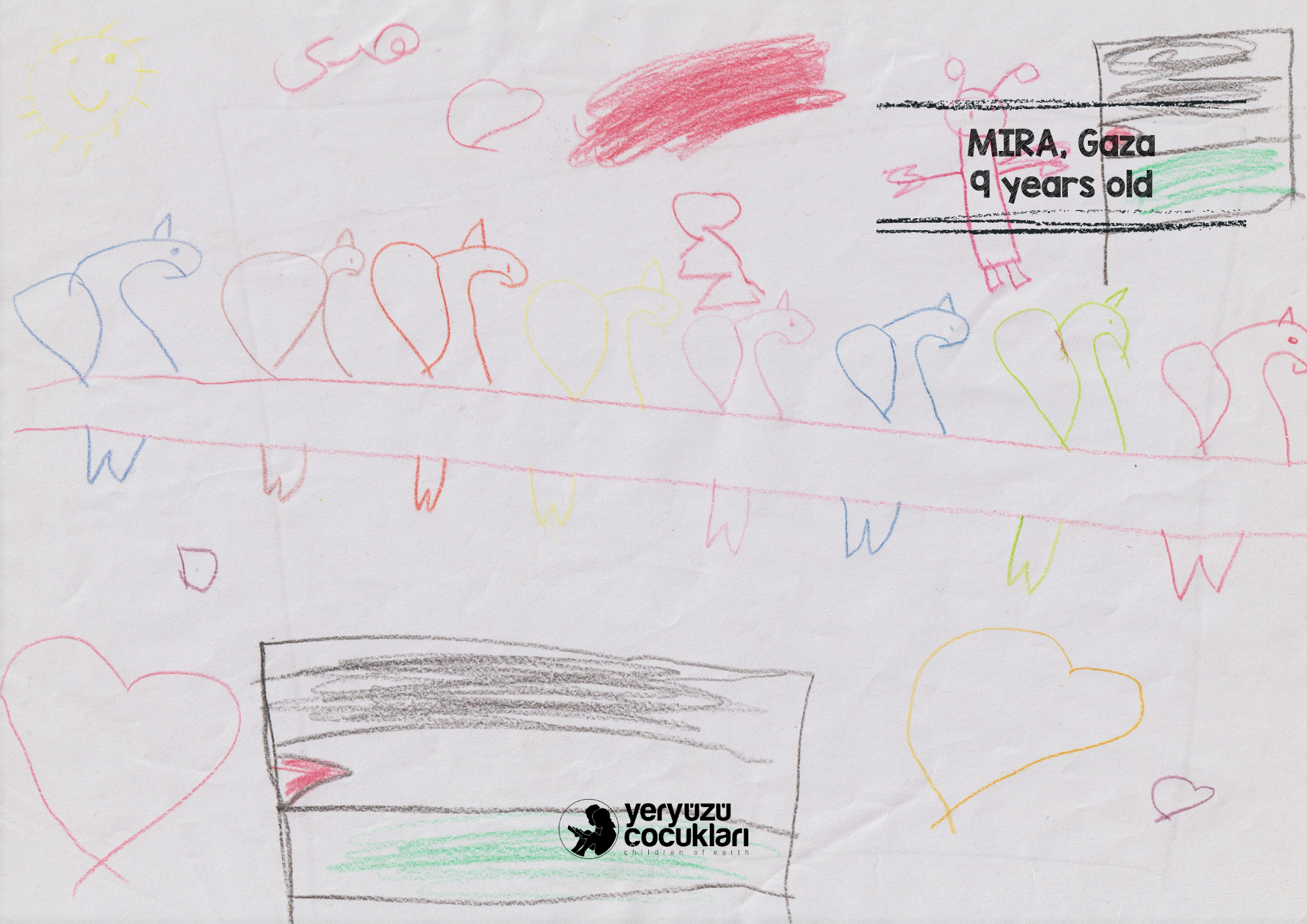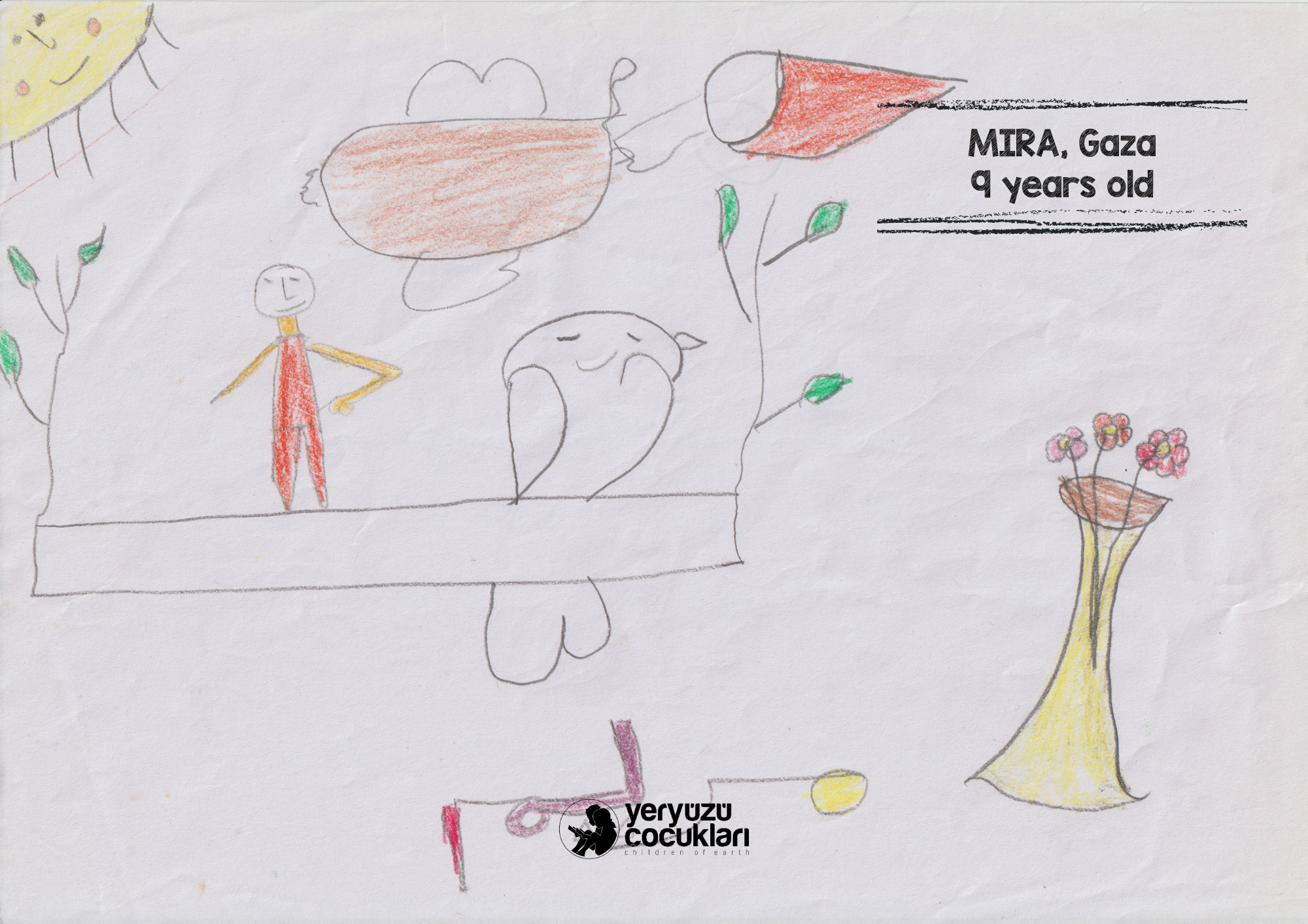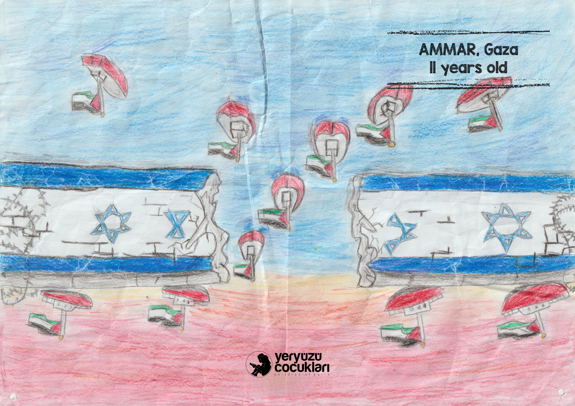 Bologna Festivali’nde sergilenen bu resimler, Gazze’nin sessiz çığlığını çocukların saf ve güçlü dünyasıyla duyurmayı amaçlıyor. Bu özel seçki; hem dünyanın dört bir yanından farklı uyruklardaki çocukların Gazze ile dayanışma içinde çizdiği eserleri hem de 7 Ekim sonrası Türkiye’ye gelen Gazzeli çocukların bizzat kendi elleriyle kağıda döktüğü tanıklıkları bir araya getiriyor. Üç yıldır Türkiye’ye sığınan 300’den fazla çocukla psikososyal destek çalışmaları yürüten ve faaliyetlerini doğrudan Gazze içerisinde de sürdüren YEÇED olarak, bu çizimleri sadece birer sanat eseri değil; kuşatma altında büyümenin getirdiği ağır duygusal yükün birer yansıması olarak görüyoruz. Amacımız, çocukların yaşadıklarını bu uluslararası platformda görünür kılarak Gazze’nin hikâyesini hafızalarda diri tutmak ve vicdan sahibi herkesi bu insani sorumluluğa ortak etmektir.